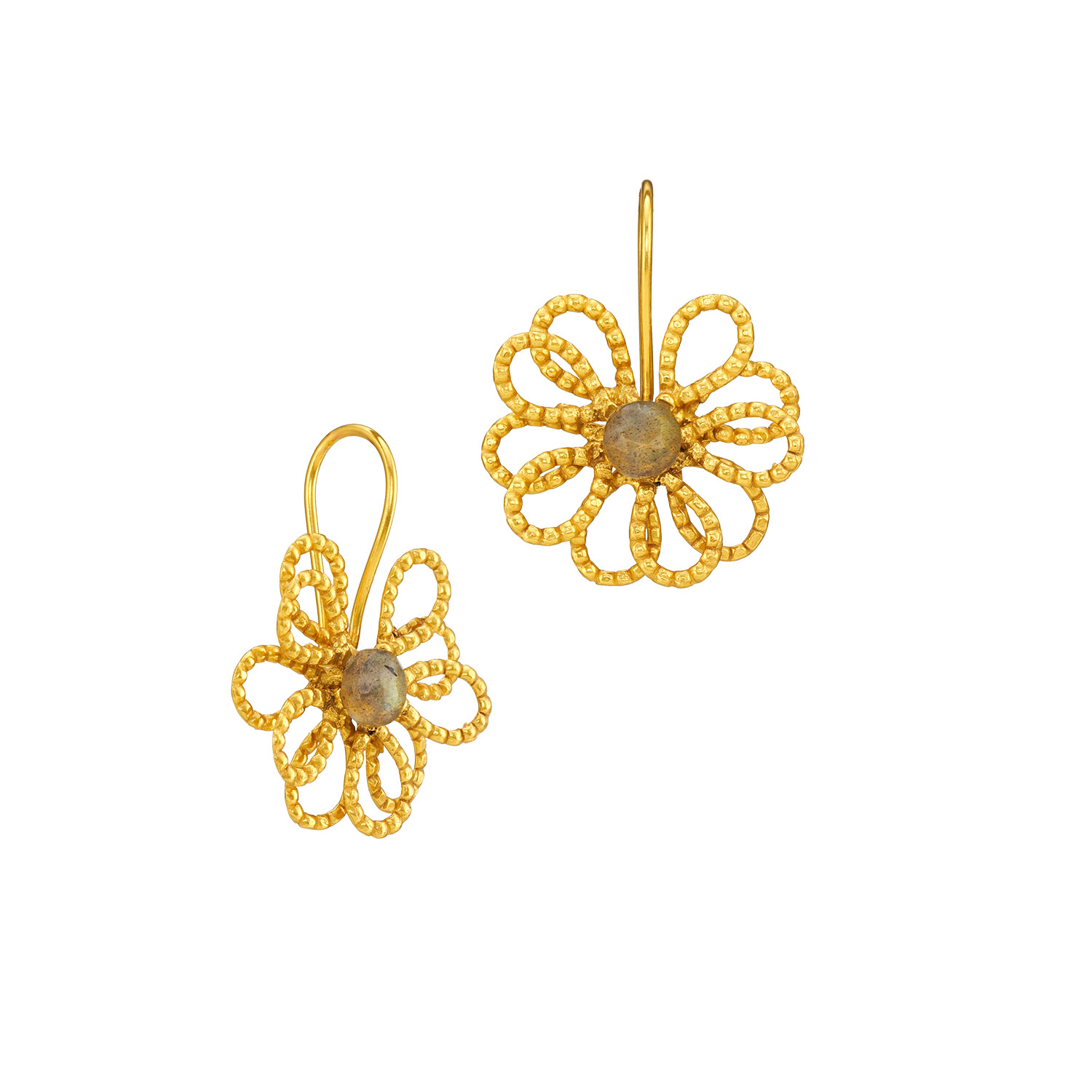 Drei Edelsteine in einer Reihe ergeben ein wunderbares Paar Ohrringe. Sehen Sie, wie gut ihre verschiedenen Formen und Farben miteinander zusammenspielen.