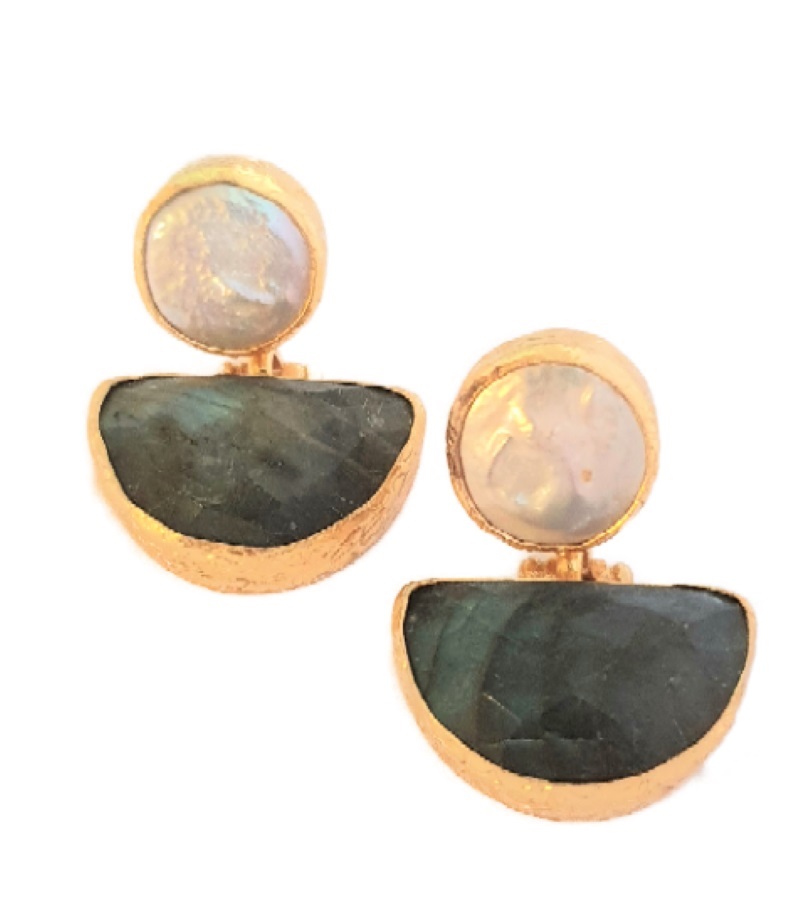 Earring made from brass, goldplated, labradorite + baroque pearl (clip)